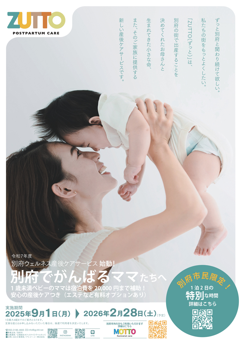 この「MOTTO(もっと)」は、「もっと別府の良さを知ってほしい」「もっと別府を訪れてほしい」「もっと皆さまのウェルネスを実現したい」という思いを込め、産後1年未満のお母さんと赤ちゃんを対象に、別府市内のホテルや旅館でゆっくり過ごしながら、助産師などによる健康チェック、授乳や子育ての相談、赤ちゃんの一時預かりなどを受けられる産後ケアサービスです。
