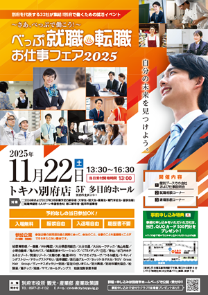 別府市より「~さあ、べっぷで働こう!~ べっぷ就職♨転職お仕事フェア2025」のご案内です。