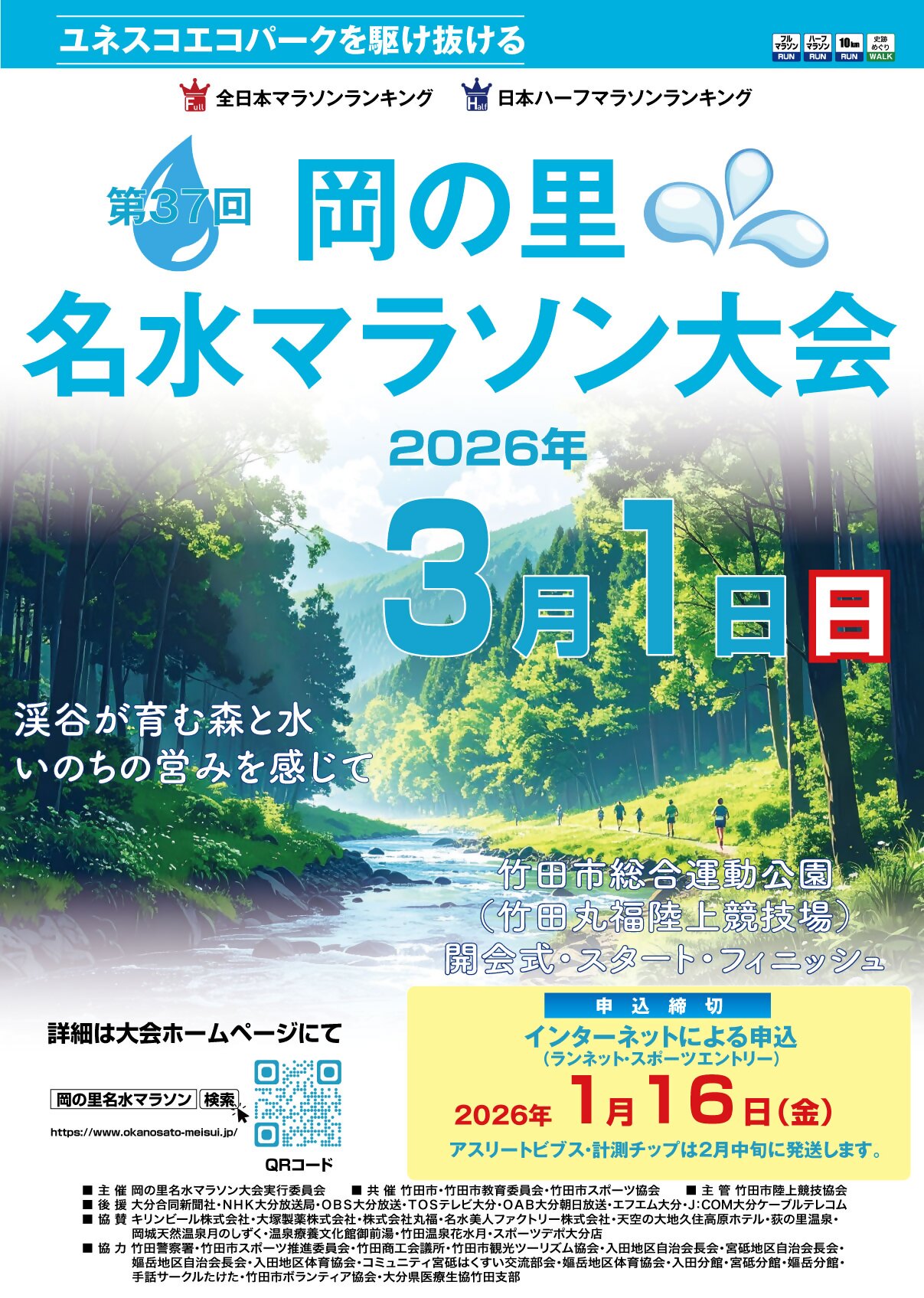 申込方法はインターネットでお申込いただけます。パソコンまたはスマートフォンからアクセスいただいて、令和8年1月16日(金)までにエントリーをお願いします。ぜひ、渓谷が育む森と水、いのちの営みを感じながら風光明媚なコースを走ってみませんか?多くの皆さんのエントリーをお待ちしています。