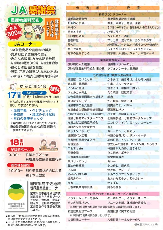 また新規就農に関する相談ブースや「きつき制服バンク」ブースが設置され、無料で体力測定や血管年齢測定等ができる「からだ測定会☆in農林水産祭」も行われます。