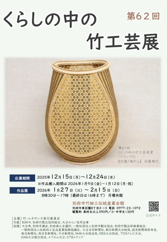 くらしの中の竹工芸展は、「竹の器と暮らす心豊かな生活」をテーマに、美術性だけでなく、日常生活に密着した商品性のある竹工芸作品を顕彰し、別府竹細工の振興を図ることを目的とした公募作品展で、今回も全国から作品を募集し、優秀作品を表彰します。